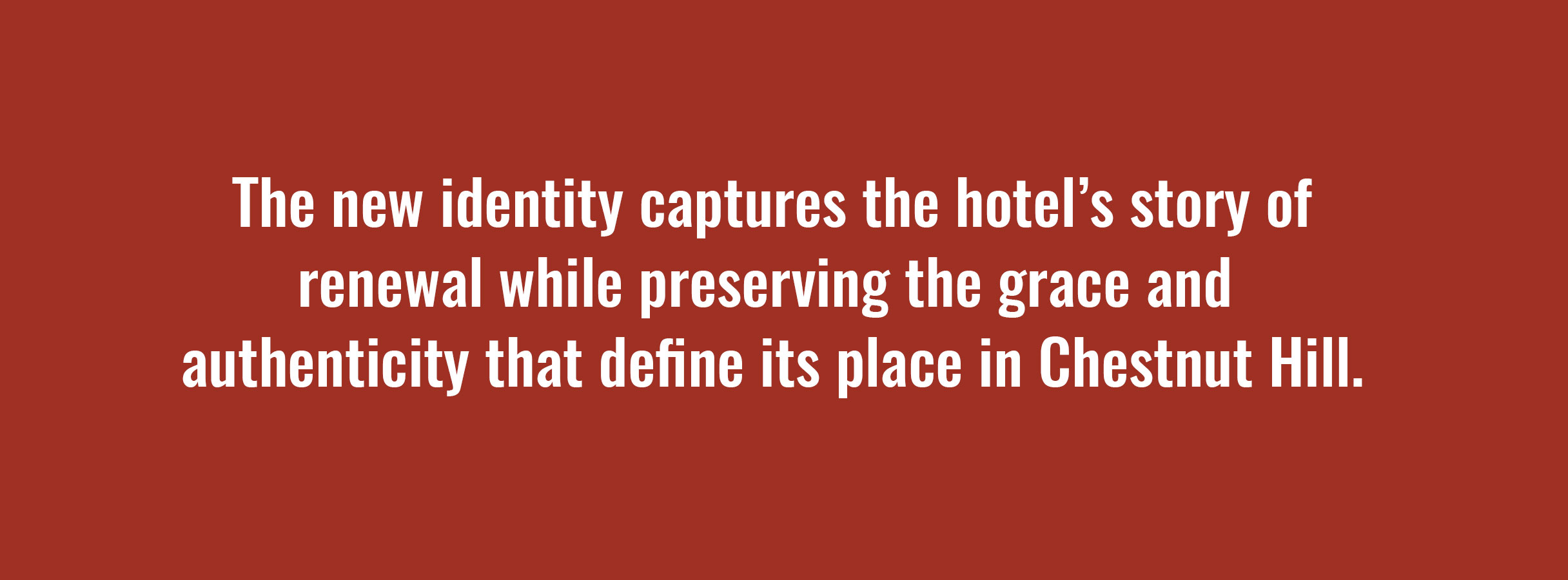 In the heart of Chestnut Hill, this historic boutique hotel has been a local favorite for generations. When new ownership took over, they set out to refurbish the property with care, honoring its heritage and warmth while elevating the experience for today’s guests. However, the existing visual identity felt dated and inconsistent with the property’s revitalized aesthetic.