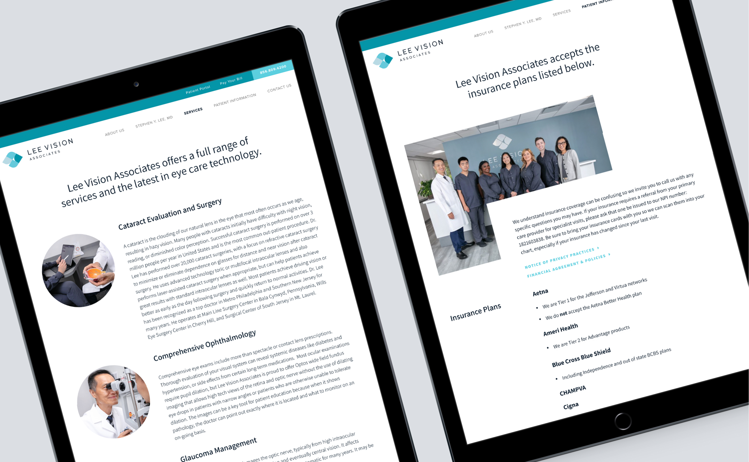 For this unique audience seeking vision care, we created a design system built on easy-to-read sans-serif fonts, ample white space, and a color palette of muted blueish teals to convey calming vibes. We crafted a sophisticated mark that symbolizes frames of vision that come together in the shape of an eye. The website balances depth of expertise and clinical information with the warmth of this family-run practice. Professional photography plays a key role, showing real interactions, the practice environment, and the advanced equipment that sets Lee Vision apart. The final website experience is bright, clean, and highly approachable.